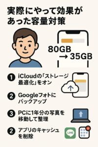特におすすめはこの3つ:『iCloudの最適化』、『Googleフォト併用』、『PC or 外付けストレージで定期バックアップ』