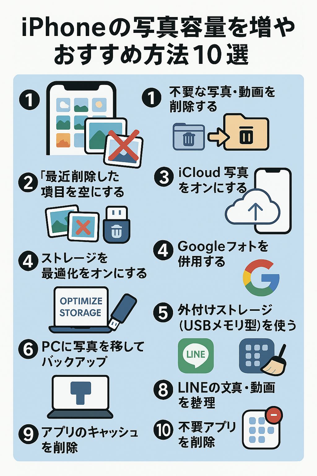 「iCloudの最適化をオンにしたら一気に容量が空いた!」、「Googleフォトが無料で便利すぎる」、「外付けストレージを買ってから、写真整理がラクになった」、「LINEの写真が10GB以上あって驚いた」